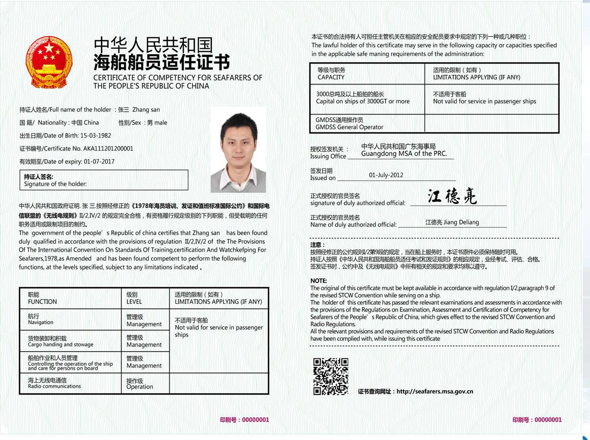 中華人民共和國海船船員適任證書